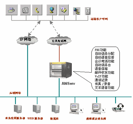- 話務(wù)自動(dòng)分配ACD功能:對撥入系統(tǒng)內(nèi)部的電話,可以選用撥入電話自動(dòng)分配到員工的話機(jī)上,如對同一個(gè)業(yè)務(wù)功能相同的部門, AltiWare