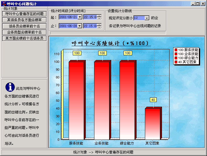 下圖為AP Suite的呼叫中心劣績統(tǒng)計(jì)圖,通過此統(tǒng)計(jì)可以了解到呼叫中心目前存在的一些問題,從而對(duì)話務(wù)員進(jìn)行針對(duì)性的培訓(xùn)。