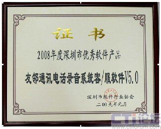 2009年1月,友鄰?fù)ㄓ嶋娫掍浺粝到y(tǒng)客/服軟件V5.0 榮獲由深圳市軟件行業(yè)協(xié)會頒發(fā)的“2008年度深圳市優(yōu)秀軟件產(chǎn)品”榮譽證書!2008年度深圳市優(yōu)秀軟件產(chǎn)品”的評選是深圳市軟件行業(yè)協(xié)會在全市范圍內(nèi)舉辦的軟件產(chǎn)品推優(yōu)活動,經(jīng)過了企業(yè)申報、技術(shù)資料審核、專家評審等等幾大嚴格篩選程序。