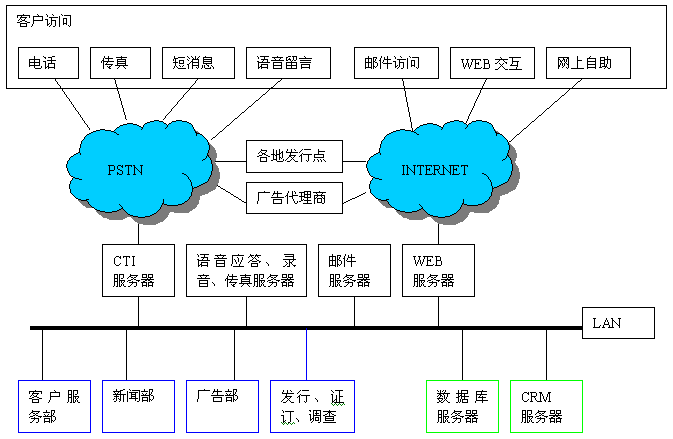 硬件方面,采用價(jià)格經(jīng)濟(jì)、功能靈活的基于語(yǔ)音板卡的呼叫中心平臺(tái)。在軟件方面,采用高可靠性的實(shí)時(shí)LINUX操作系統(tǒng)。具有高效、穩(wěn)定、安全以及功能齊全等特點(diǎn)。坐席端軟件實(shí)現(xiàn)了強(qiáng)大電話處理功能,支持實(shí)時(shí)錄音、兼聽(tīng)、強(qiáng)插、強(qiáng)拆等應(yīng)用;跒g覽器的瘦客戶端與CRM的客戶界面完美融合。并且提供詳盡的報(bào)表功能。支持智能化路由、多種排隊(duì)策略的選擇,實(shí)現(xiàn)與CRM無(wú)縫結(jié)合。