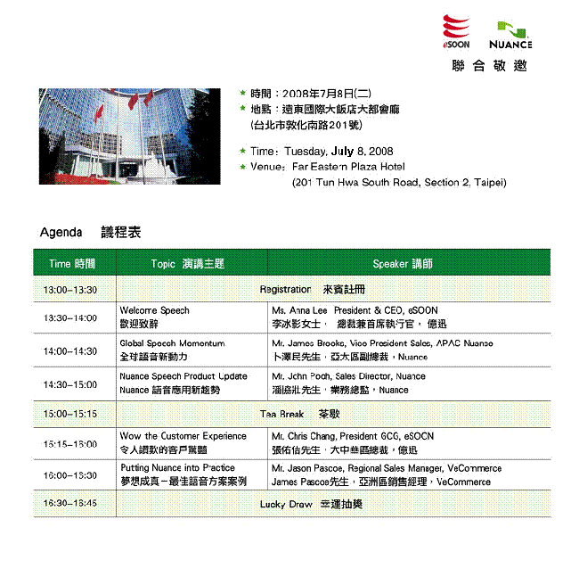 2008“Nuance語(yǔ)音技術(shù)高峰論壇”臺(tái)北站7月8日將于遠(yuǎn)東國(guó)際大飯店舉行
