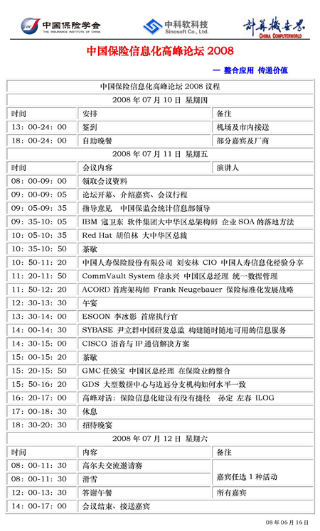 7月10日至12日, 中國(guó)保險(xiǎn)信息化高峰論壇2008將于北京順義區(qū)喬波國(guó)際會(huì)議中心盛大舉行, 此次大會(huì)的邀請(qǐng)來(lái)賓有包括中國(guó)人保,太平保險(xiǎn),中國(guó)人壽,中國(guó)太平洋保險(xiǎn),華泰保險(xiǎn),陽(yáng)光財(cái)險(xiǎn)等保險(xiǎn)業(yè)的最優(yōu)秀的企業(yè)。億迅作為最佳廠商之一,也得到該會(huì)主辦方的盛情邀請(qǐng),屆時(shí)將與各大保險(xiǎn)企業(yè)技術(shù)主管,保險(xiǎn)公司副總經(jīng)理,保監(jiān)會(huì)相關(guān)領(lǐng)導(dǎo)以及資深保險(xiǎn)行業(yè)信息化建設(shè)專(zhuān)家共同聆聽(tīng)來(lái)自保監(jiān)會(huì)領(lǐng)導(dǎo)的指導(dǎo)性意見(jiàn),交流重要企業(yè)的優(yōu)秀解決方案,分享系統(tǒng)集成商的最直接方案對(duì)比。會(huì)議期間,億迅公司大中華區(qū)執(zhí)行副總張佑佶先生將有一個(gè)演講時(shí)段,與保險(xiǎn)業(yè)的新老朋友共同研討“呼叫中心信息化在兩岸三地的魅力趨勢(shì)”,全情期待中……