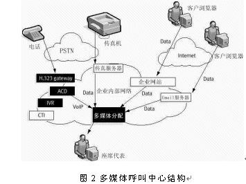多媒體呼叫中心實際上是基于CTI技術(shù)的傳統(tǒng)呼叫中心和互聯(lián)網(wǎng)呼叫中心的相互結(jié)合,其接入手段不但有傳統(tǒng)的電話、而且包括了傳真接入、Email接入、Web接入和IP電話接入等。典型的多媒體呼叫中心結(jié)構(gòu)如圖2所示。