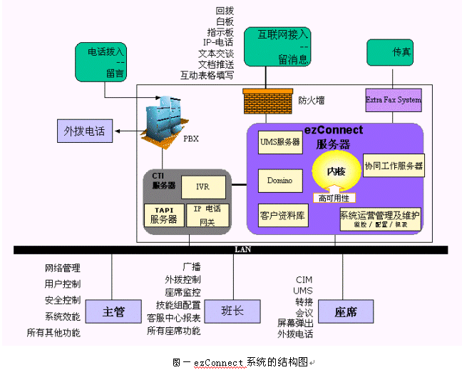 ezConnect系統(tǒng)是由訊泰信息科技公司的北京研發(fā)中心設計開發(fā)出來的一個成熟的多媒體呼叫中心產(chǎn)品。支持傳統(tǒng)電話、web、電子郵件、傳真、語音郵件、IP電話、短消息、WAP等用戶接入方式;對客戶請求采用基于座席技能的智能分派;提供文本交談、白板共享、協(xié)同填表、文檔推送、IP電話、短消息發(fā)送等多種實時交流工具;有非常實用的實時監(jiān)控和報表子系統(tǒng)。核心部分的設計采用分離分層的思想,實現(xiàn)了相對于PBX、IVR、CRM的透明性。系統(tǒng)的配置非常靈活,可以在很短的時間內(nèi)完全改變整個客戶端的風格,或支持一種新的語言。整個系統(tǒng)建立在Java平臺上,具有良好的可移植性。下面是ezConnect系統(tǒng)的結(jié)構(gòu)圖: