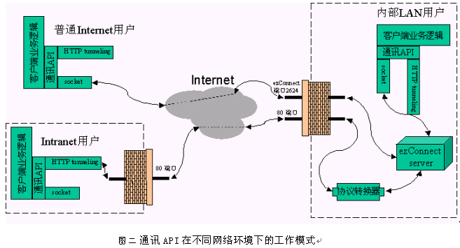 普通Internet用戶(例如撥號上網(wǎng)或小區(qū)ADSL)對Internet資源的訪問一般不受限制,所以只需解決如何穿越保衛(wèi)著ezConnect服務器的防火墻的問題。訊泰公司的方案是開發(fā)一套通用的通訊API, 在此API的基礎上實現(xiàn)呼叫中心客戶端的業(yè)務邏輯(參見下圖)。這個通訊API的底層有兩種方式:直接socket連接和HTTP隧道,API會自動檢測其所處的網(wǎng)絡環(huán)境來選擇適當?shù)牡讓舆B接方式。一般而言,保障著ezConnect服務器的防火墻應該開放著ezConnect的協(xié)議端口2624。 所以普通Internet用戶訪問ezConnect系統(tǒng)時,客戶端軟件與服務器軟件通過建立直接的socket連接來互通信息。目標3由此達到。