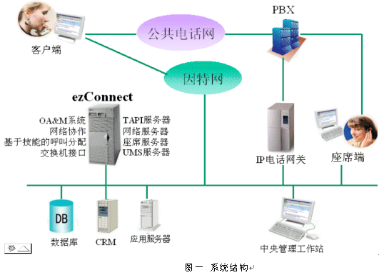 為了充分發(fā)揮現(xiàn)有系統(tǒng)的潛在能力,集成世界一流的產(chǎn)品以最大限度為客戶服務(wù),因特網(wǎng)呼叫中心的發(fā)展需要具備與多種系統(tǒng)交互的能力,充分發(fā)揮各種軟硬件的長(zhǎng)處。電話和因特網(wǎng)呼叫中心解決方案ezConnect™是按照工業(yè)標(biāo)準(zhǔn)設(shè)計(jì)的系統(tǒng),系統(tǒng)基于Windows NT操作系統(tǒng),采用廋客戶端設(shè)計(jì)思想設(shè)計(jì),使用業(yè)界流行的Visual C++ 和Java實(shí)現(xiàn),可以作為開發(fā)平臺(tái)做二次開發(fā),也可以經(jīng)參數(shù)配置后直接投入使用。