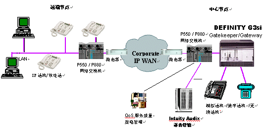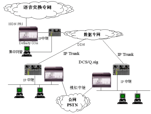 隨著IP網(wǎng)絡(luò)技術(shù)的不斷發(fā)展,數(shù)據(jù)網(wǎng)絡(luò)的融合能力越來越強(qiáng)。AVAYA在全球范圍內(nèi)率先推出全面符合H.323標(biāo)準(zhǔn)的VoIP解決方案及基于IP中繼的DCS/Q.sig專網(wǎng)透明功能信令。通過IP中繼將公司全部分支包括機(jī)構(gòu)的DEFINITY交換機(jī)進(jìn)行連接,同樣可以提供全面的專網(wǎng)透明功能和網(wǎng)絡(luò)呼叫中心應(yīng)用,DEFINITY IP中繼可提供豐富的語音壓縮能力,從64Kbps的無壓縮傳輸?shù)?Kbps的經(jīng)濟(jì)傳輸方案均可提供,同時(shí)通過復(fù)用在IP包中的DCS/Q.sig信令提供透明功能。