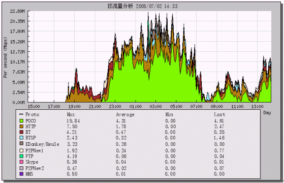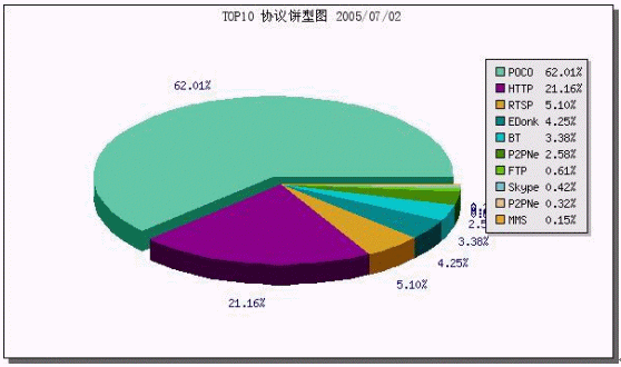 - 監(jiān)控時間段內(nèi),POCO流量占62.01%,HTTP占21.16%,RTSP(在線視頻)占5.1%,P2P業(yè)務(wù)(包括EDonkey、P2PNE、BT等)占10.53%,F(xiàn)TP為0.61%,其他業(yè)務(wù)不到0.59%。如下圖:
