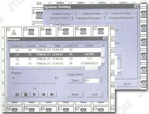 當(dāng)電話打進(jìn)來,系統(tǒng)便自動(dòng)進(jìn)行錄音,系統(tǒng)把語音信號(hào)以數(shù)字化語音格式寫入硬盤。同時(shí)系統(tǒng)記錄其通話日期,摘機(jī)時(shí)間,掛機(jī)時(shí)間和當(dāng)前通話時(shí)間等信息,如果該次電話為打出電話,還可記錄其打出的電話號(hào)碼。掛機(jī)時(shí)系統(tǒng)便會(huì)自動(dòng)停止錄音。 |