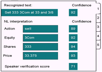 也可使用外部的應(yīng)用知識內(nèi)容來確定多結(jié)果中的哪一個是有效的。例如,經(jīng)紀(jì)業(yè)務(wù)應(yīng)用程序,它的用戶投資隨時間變化而變化。系統(tǒng)可使用簡單的語法來識別股票證券的名稱。識別時,系統(tǒng)產(chǎn)生一個最佳前N個股票名稱的清單,標(biāo)明假設(shè)的股票證券名稱。應(yīng)用程序然后將每個清單項目(由最佳到最差)和現(xiàn)有股票證券名稱進(jìn)行比較,從而為該用戶找到可能性最大的一個。下圖展示的是這些多結(jié)果情況,每個結(jié)果都可能有它自身的已被識別的文本、NL解釋和置信度分值。在這一例中,請求了五個識別結(jié)果。
