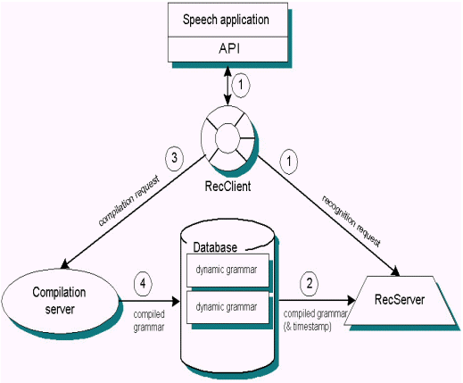 本部分詳述動態(tài)語法和其它Nuance系統(tǒng)組件之間的交互。下圖說明處理的各個步驟,隨后是每個步驟的說明。