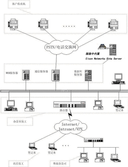 本系統(tǒng)采用最新的J2EE WEB技術(shù),在組成結(jié)構(gòu)上主要由以下三大模塊組成:1)WEB服務(wù)器: 完成用戶通過IE瀏覽器接入訪問, 傳真發(fā)送及接收的操作界面,傳真結(jié)果的查詢,客戶地址本的維護(hù)等工作;2)傳真發(fā)送/接收通信服務(wù)器:主要完成驅(qū)動傳真板卡,通過通信線路收發(fā)傳真,檢測通信線路、對方狀態(tài),發(fā)送接收隊列管理等工作;3)數(shù)據(jù)庫服務(wù)器:主要負(fù)責(zé)用戶信息,用戶地址本信息,傳真記錄等信息存儲工作。