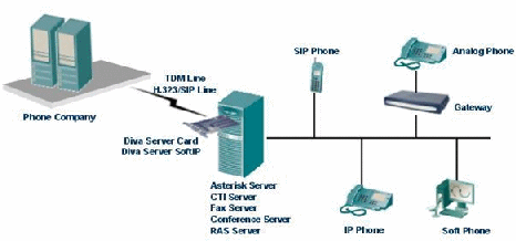 Diva Server硬件平臺自身強大的通信能力、板載資源、媒體處理能力和多種接口等而產(chǎn)生的一種高效、便捷、低成本的應用方案。與傳統(tǒng)PBX及IP