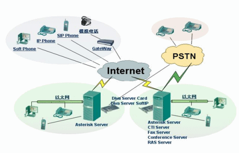使用Asterisk與Eicon Diva Server卡相配合形成的IP-PBX系統(tǒng)大大區(qū)別于傳統(tǒng)基于PSTN的PBX和簡單的IP PBX: