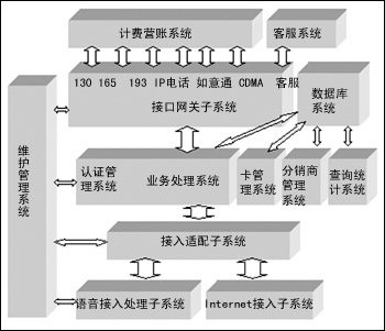 綜合付費平臺的軟件邏輯結構分為語音接入處理子系統(tǒng)、Internet 接入子系統(tǒng)、接入適配網關子系統(tǒng)、認證管理子系統(tǒng)、業(yè)務處理系統(tǒng)、卡管理系統(tǒng)、分銷商管理系統(tǒng)、查詢統(tǒng)計系統(tǒng)、數據庫系統(tǒng)、接口網關子系統(tǒng)和維護管理子系統(tǒng)。