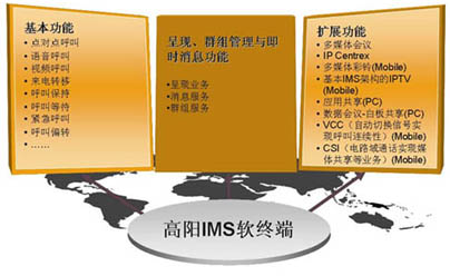 高陽IMS軟終端產(chǎn)品線是基于IMS(IP多媒體子系統(tǒng))技術(shù),以通信終端功能為主,融入IT特性,將在線狀態(tài)、即時消息和群組管理融為一體,集合語音、數(shù)據(jù)、視頻通信,提供統(tǒng)一的用戶體驗,實現(xiàn)移動電話、PC之間的互聯(lián)互通,并且符合3GPP/ETSI/OMA/IETF/ITU-T等國際標準組織和中國電信/中國移動規(guī)定的IMS相關(guān)規(guī)范。