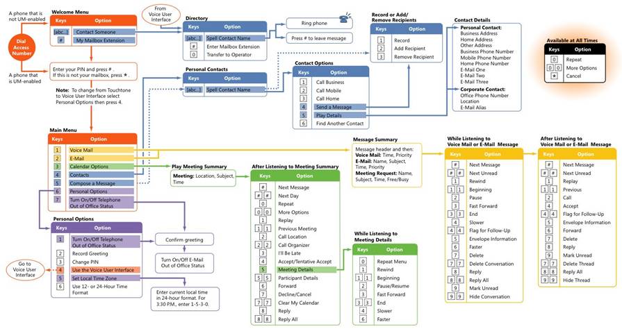 允許用戶通過電話處理他們的消息和日歷數(shù)據(jù)(包括收聽、轉(zhuǎn)發(fā)和回復(fù)電子郵件,以及發(fā)出、更新或響應(yīng)會(huì)議請(qǐng)求)。用戶可以標(biāo)記消息以便跟蹤、跳到下一封未讀郵件、隱藏或刪除對(duì)話,甚至查找來(lái)自特定用戶的消息,這一切全都使用語(yǔ)音導(dǎo)航或標(biāo)準(zhǔn)按鍵式鍵盤來(lái)完成。