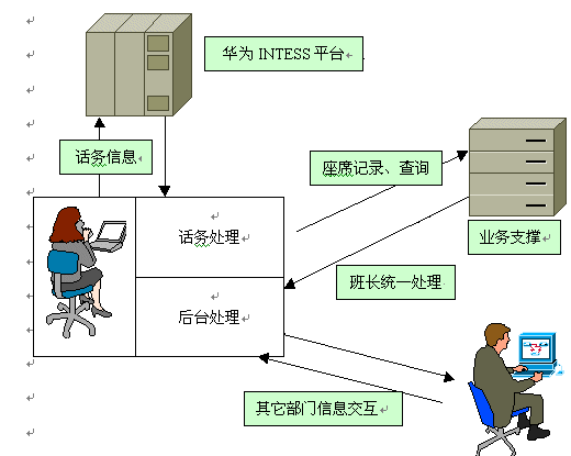 該系統(tǒng)在鐵通CRIS 平臺上運(yùn)行,前端接入采用華為CC08-A型排隊機(jī),華為INTESS平臺,集成正邦高科座席軟件。完成企業(yè)業(yè)務(wù)咨詢、投訴建議的受理、產(chǎn)品訂購、外呼調(diào)查等業(yè)務(wù),并針對各業(yè)務(wù)的特色規(guī)劃了企業(yè)的業(yè)務(wù)流程。正邦高科客戶服務(wù)系統(tǒng)的坐席軟件,和華為INTESS采用緊耦合方式將話務(wù)信息和業(yè)務(wù)信息結(jié)合在一起,便于統(tǒng)計分析,制訂客戶服務(wù)中心的運(yùn)營策略。在后臺業(yè)務(wù)管理系統(tǒng)中,客戶服務(wù)系統(tǒng)設(shè)計了便于分析業(yè)務(wù)的一系列統(tǒng)計報表,使企業(yè)可以方便地對銷售過程進(jìn)行跟蹤和定單派發(fā)。