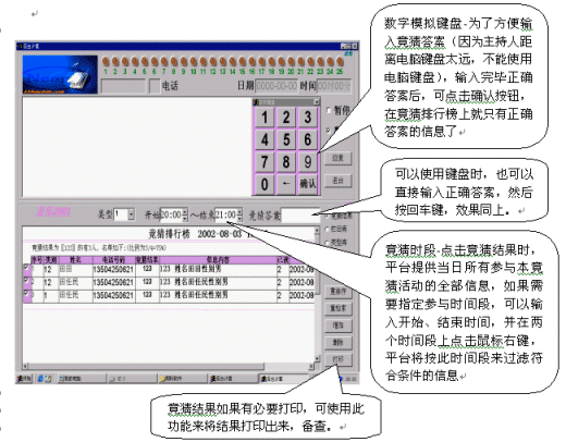 竟猜前必須對聽眾廣播,為了竟猜的準(zhǔn)確性,希望發(fā)送信息時,必須把竟猜結(jié)果發(fā)送在前面, 如(12345姓名李立),否則,系統(tǒng)將不能識別其答案。竟猜結(jié)束時,只要點(diǎn)擊竟猜結(jié)果選項,系統(tǒng)會自動將所有參與本節(jié)目的竟猜結(jié)果統(tǒng)計出來(此時沒有限制時間段),如果需要限制時間段,則應(yīng)在"開始"、"結(jié)束"時間段中輸入開始和結(jié)束的時間,并在其中任何一個時間段上點(diǎn)擊鼠標(biāo)右鍵,系統(tǒng)將會自動過濾出符合條件的信息。