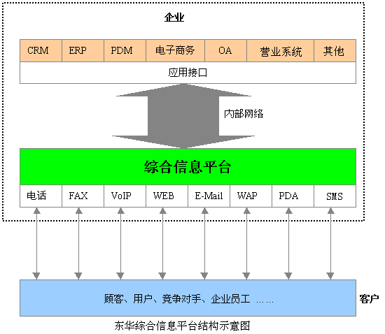 東華集團(tuán)綜合信息平臺(tái)系統(tǒng)可集中企業(yè)客戶服務(wù)的優(yōu)勢(shì)資源,采用人工業(yè)務(wù)代表服務(wù)與自動(dòng)語(yǔ)音服務(wù)相結(jié)合的形式,通過電話、Email、Web、尋呼、IP電話/傳真、視頻、段消息等接入方式和服務(wù)手段,向客戶提供業(yè)務(wù)受理、信息查詢、商品定購(gòu)服務(wù),以及接受客戶的咨詢、建議及投訴,也可以通過主動(dòng)撥出做社會(huì)調(diào)查、市場(chǎng)調(diào)查、商品直銷及資費(fèi)欠費(fèi)催繳等。