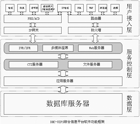 即DHC-UIPS綜合信息平臺(tái)的接入端,包括IVR流程、人工坐席等,它是用戶進(jìn)入多媒體客服中心客服系統(tǒng)的入口,它將直接面對(duì)用戶并收集各種信息。支持電話、傳真、電子郵件、WEB訪問、WAP、PDA、IP電話、網(wǎng)絡(luò)電話、視頻電話等多種方式接入。