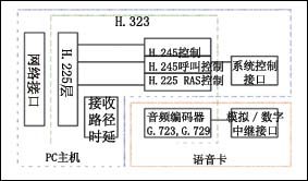 用語音卡來搭建IP超市的核心在于如何用語音卡來搭建一個VoIP的語音網(wǎng)關(guān)。由于增加了VoIP功能,與傳統(tǒng)的CTI集成相比較,用語音卡來搭建一個VoIP的語音網(wǎng)關(guān),更富有挑戰(zhàn)性:語音卡除需要實(shí)現(xiàn)原有的模擬或數(shù)字電路接口外,還需要實(shí)現(xiàn)語音壓縮的編解碼、語音在IP網(wǎng)的傳輸協(xié)議以及解決好由此而產(chǎn)生的如回聲消除、靜音抑制、去時延抖動、QoS控制等問題。語音編碼標(biāo)準(zhǔn)一般要支持G.729、G.723等,目前國內(nèi)絕大多數(shù)VoIP網(wǎng)絡(luò)采用H.323協(xié)議棧,從兼容性考慮,用語音卡搭建的VoIP語音網(wǎng)關(guān)也應(yīng)采用H.323協(xié)議。其結(jié)構(gòu)如圖1所示。
