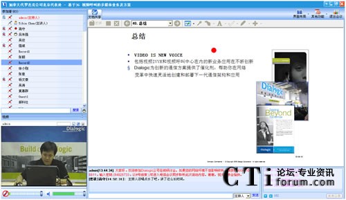 作為最早將3G語(yǔ)音視頻技術(shù)引入中國(guó)的世界級(jí)技術(shù)提供商,Dialogic在語(yǔ)音應(yīng)用和3G視頻一直具有領(lǐng)先競(jìng)爭(zhēng)力。在此次“基于3G視頻呼叫的多媒體業(yè)務(wù)及方案”網(wǎng)絡(luò)研討會(huì)上,Dialogic中國(guó)區(qū)技術(shù)總監(jiān)陳益斌,以音視頻的在線直播方式,親身向與會(huì)觀眾講解Dialogic基于3G視頻呼叫的業(yè)務(wù),以及與3G數(shù)據(jù)業(yè)務(wù)的區(qū)別等前瞻3G視頻技術(shù)。