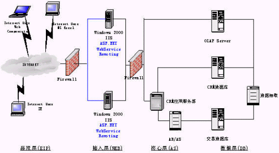 展現(xiàn)層實(shí)現(xiàn)定制化的、支持各種接入設(shè)備的統(tǒng)一消息平臺是非常必要的,它必將極大地促進(jìn)公司服務(wù)產(chǎn)品的發(fā)展。在展現(xiàn)層我們還強(qiáng)調(diào)企業(yè)信息門戶的建立:信息不是孤立的,需要一個統(tǒng)一的、互動的、個性化的、全面的綜合表現(xiàn)形式,以更方便公司人員對信息的獲取,作出正確的決策。使用ASP.Net和OfficeXP Web Components OLAP展示工具,并能有機(jī)的與辦公自動化工具結(jié)合起來。