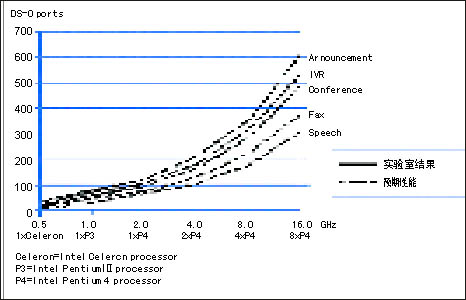 圖1顯示了主要的通信媒體處理功能的實驗測量結(jié)果和預(yù)期性能。Intel 編制的HMP軟件,在Intel的從566 MHz 到 2 GHz的Celeron和 Pentium 處理器上,已經(jīng)對語音宣告、IVR和會議算法完成了實現(xiàn)、優(yōu)化和測試。圖1中的實線表示實驗室中的測試結(jié)果。Intel的目標是實現(xiàn)這些算法,并擴展到更高速的Intel Pentium處理器,雙路、四路、甚至八路Intel Pentium處理器、Intel Xeon處理器以及Intel Itanium處理器。圖1中的虛線顯示了Intel所期望的在未來的實現(xiàn)中將得到的結(jié)果。目前,HMP的版本主要以Windows為主,很快就會推出Linux版本。從根本上說,HMP最適合用在純IP的環(huán)境,也可通過擴展到多個服務(wù)器實現(xiàn)密度的提升。