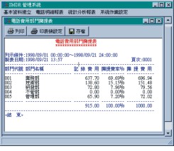 TeleSMDR話務分析計費系統,是一套搭配舜遠交換機的專屬電話計費系統。TeleSMDR 為您詳細記錄每一通外撥的電話通話時間、撥號號碼等,并且還提供完整電話帳及查詢報表、電話費用攤提等功能,如您可查詢特定分機在特定日期是否有打過國際電話。公司內所有分機的通話時間、通話費、撥號號碼等將在計算機上一覽無遺。