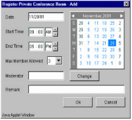 TeleConference系統(tǒng)內(nèi)的任一個(gè)分機(jī),都可以利用瀏覽器(Internet Browser)來(lái)預(yù)約會(huì)議時(shí)間,而參加會(huì)議的人可以在會(huì)議開(kāi)始時(shí),自動(dòng)打電話進(jìn)系統(tǒng)參加會(huì)議就像加入“聊天室“一樣簡(jiǎn)單。