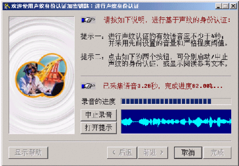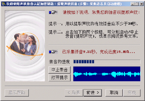 點(diǎn)擊"提取聲紋"按鈕,按正常方式說出含有30秒有效語(yǔ)音的任意一段話(在此過程中,可隨時(shí)點(diǎn)擊"中止錄音"以放棄語(yǔ)音采集,并重新開始)。