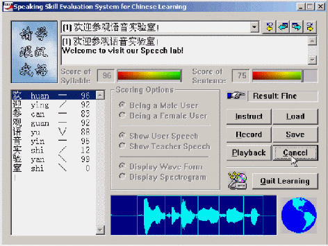 "得意"口語學(xué)習(xí)系統(tǒng)的原理是基于語音音素及其他參數(shù)的提取與分割,將使用者的語音音素系列與標(biāo)準(zhǔn)模型的語音音素序列進(jìn)行自動比對,并將比對結(jié)果通過視圖形象而直觀地給出,從而對學(xué)習(xí)者的語音給出恰當(dāng)?shù)脑u價(比如對每個音素給出一個得分等),以幫助其改進(jìn)和提高口語發(fā)音,使其接近或達(dá)到語音的標(biāo)準(zhǔn)水平。由于利用可視化的朗讀評分等人機交互的方式,而且通過視覺、聽覺等綜合手段,反復(fù)提示和幫助用戶接近標(biāo)準(zhǔn)發(fā)音,因而顯著提高了學(xué)習(xí)者的學(xué)習(xí)興趣,這對提高英語學(xué)習(xí)成績有很多幫助。