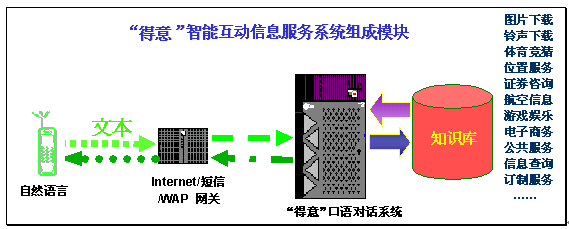 "得意"智能互動(dòng)信息服務(wù),是對(duì)用戶(hù)輸入的文本進(jìn)行自動(dòng)分析和理解,再?gòu)闹R(shí)庫(kù)中提取用戶(hù)所需的信息,然后自動(dòng)產(chǎn)生智能應(yīng)答語(yǔ)句,并以文本的形式通過(guò)電腦或者手機(jī)發(fā)回用戶(hù)。由于"得意"口語(yǔ)對(duì)話(huà)系統(tǒng)具有上下文相關(guān)理解和人機(jī)混合主導(dǎo)等強(qiáng)大功能,在指定的領(lǐng)域內(nèi),用戶(hù)可通過(guò)一次或者多次輸入(包括詞語(yǔ)、句子)構(gòu)成一組對(duì)話(huà),完成復(fù)雜的信息查詢(xún)或者其他互動(dòng)信息服務(wù)。