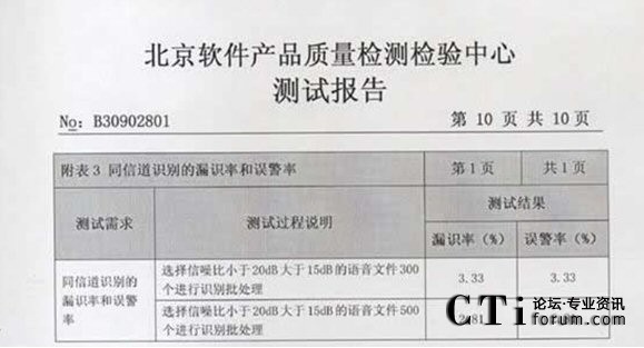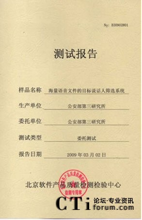 CTI論壇(ctiforum)06月25日消息: 2009年3月02-10日:北京軟件產(chǎn)品質(zhì)量檢測檢驗中心對《海量語音文件的目標(biāo)說話人篩選系統(tǒng)》進行了全面測試包括用戶文檔、功能性、可靠性、易用性、可維護性等多個特性。測試結(jié)果表明《海量語音文件的目標(biāo)說話 2009年3月02-10日,北京軟件產(chǎn)品質(zhì)量檢測檢驗中心對《海量語音文件的目標(biāo)說話人篩選系統(tǒng)》進行了全面人篩選系統(tǒng)》滿足軟件相關(guān)國家標(biāo)準(zhǔn)中的要求,系統(tǒng)在模擬測試環(huán)境中運行正常、穩(wěn)定,正式通過北京軟件產(chǎn)品質(zhì)量檢測檢驗中心的嚴(yán)格測試,系統(tǒng)的漏識率和誤警率分別達(dá)到了2.81%和 2.81%。