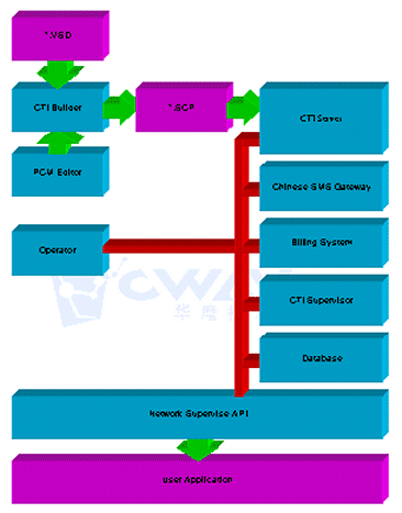 說明:圖中所有的設(shè)備都是通過網(wǎng)絡(luò)和CTI服務(wù)器交互的,我們內(nèi)部都是通過遠(yuǎn)程監(jiān)控API接口與服務(wù)器通信,也就是說,只要用戶可以按照遠(yuǎn)程監(jiān)控API的規(guī)范開發(fā)出具有自己特色的計費(fèi)系統(tǒng)、監(jiān)控系統(tǒng)等等。