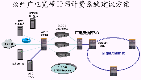 對(duì)于以上這些實(shí)際問題,北京城市熱點(diǎn)的Dr.com(AAA)計(jì)費(fèi)系統(tǒng)給予了比較完滿的解決。下面我們通過揚(yáng)州有線網(wǎng)的具體方案來實(shí)際體驗(yàn)一下。