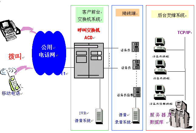 一個完整的呼叫中心解決方案通常由以下核心部分組成:自動呼叫分配(ACD)、交互式語音應(yīng)答(IVR)、計算機電話綜合應(yīng)用(CTI)、錄音服務(wù)器、呼叫管理(CMS)等。