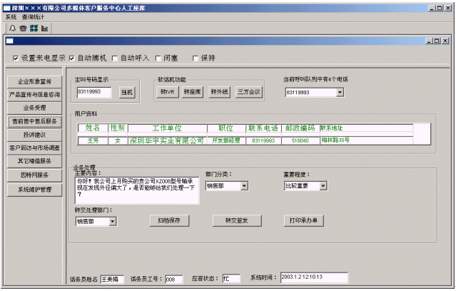 系統(tǒng)管理人員依據(jù)當(dāng)前的狀態(tài)監(jiān)控顯示掌握當(dāng)前系統(tǒng)的工作狀況,如忙閑程度、業(yè)務(wù)分布、業(yè)務(wù)代表狀態(tài)、線路狀態(tài)等。領(lǐng)導(dǎo)決策人員依據(jù)對(duì)呼叫信息的歷史統(tǒng)計(jì),進(jìn)行針對(duì)性的決策,決定系統(tǒng)的規(guī)模、人員數(shù)量等的調(diào)整,以提高系統(tǒng)的運(yùn)行效率和服務(wù)質(zhì)量。