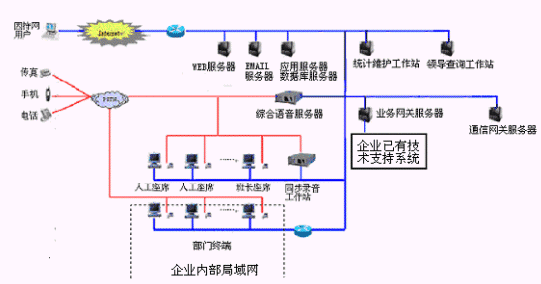 網(wǎng)上服務(wù)系統(tǒng):與INTENET結(jié)合,接受來(lái)自網(wǎng)上的呼叫請(qǐng)求,提高服務(wù)和營(yíng)銷(xiāo)的質(zhì)量和效率。