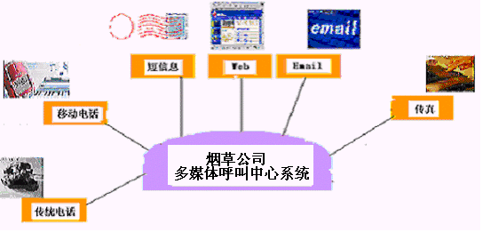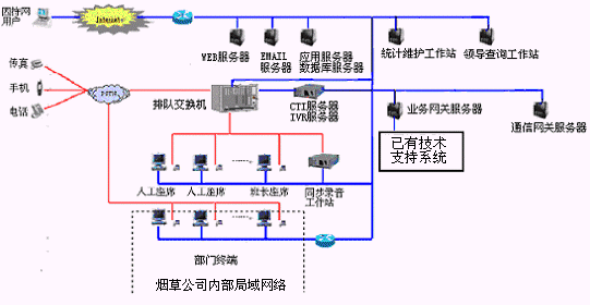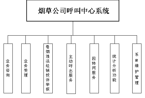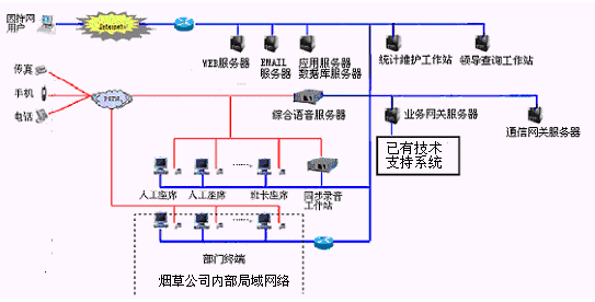 卷煙經(jīng)銷戶等客戶利用電話、傳真、電子郵件、因特網(wǎng)、手機(jī)、短消息等撥打統(tǒng)一的特服號(hào)碼(如800XXX或9XXXX)進(jìn)入煙草公司呼叫中心,本系統(tǒng)依托煙草公司各類業(yè)務(wù)技術(shù)支持系統(tǒng)和網(wǎng)絡(luò)系統(tǒng),實(shí)現(xiàn)煙草專賣局原有管理系統(tǒng)/業(yè)務(wù)系統(tǒng)及數(shù)據(jù)庫的無縫連接,通過人工受理或自動(dòng)語音服務(wù)等方式全天24小時(shí)不間斷地為客戶提供各種服務(wù)。