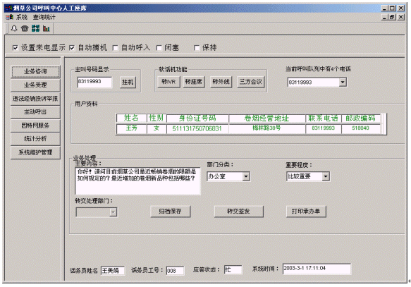 煙草公司呼叫中心將接入功能、導(dǎo)航功能、自動(dòng)語音查詢功能、人工座席服務(wù)功能、話路轉(zhuǎn)接功能、信息資料處理緊密聯(lián)系起來。用戶撥打特服電話號(hào)碼后,可以根據(jù)需要選擇人工服務(wù)、自動(dòng)語音查詢、自動(dòng)留言,并能夠在幾種服務(wù)中來回切換或轉(zhuǎn)接其它電話;所記錄的資料可以分門別類的進(jìn)行統(tǒng)計(jì)并形成報(bào)表,供相關(guān)部門進(jìn)行檢索查閱;意見處理完畢,可由座席主動(dòng)呼叫用戶,告知處理意見,形成閉環(huán)處理流程。