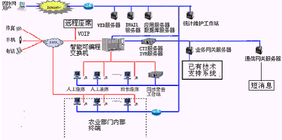 客戶利用電話、傳真、手機等撥打統(tǒng)一的特服號碼(如800XXX或9XXXX)或因特網(wǎng)進入農(nóng)業(yè)分布式呼叫中心,本系統(tǒng)依托農(nóng)業(yè)部門各類計算機業(yè)務技術(shù)支持系統(tǒng)和網(wǎng)絡系統(tǒng),實現(xiàn)與農(nóng)業(yè)部門原有管理系統(tǒng)/業(yè)務系統(tǒng)及數(shù)據(jù)庫的無縫連接,通過人工受理或自動語音服務等方式全天24小時不間斷地為客戶提供各種服務。