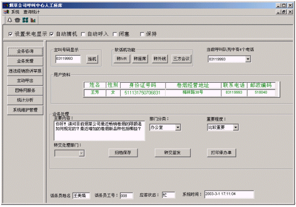 客戶打入電話后,當系統(tǒng)的自動語音應答子系統(tǒng)無法解決客戶問題時,客戶可選擇人工服務,由客戶服務代表直接接聽客戶電話,處理并解決客戶問題。此時客戶同座席話務人員直接溝通,并同時記錄下該客戶的聯(lián)系方式,將相關(guān)數(shù)據(jù)添加入系統(tǒng)數(shù)據(jù)庫;也可以在數(shù)據(jù)庫的支持下處理傳真業(yè)務,電子郵件,計算機文件傳輸、滿意度調(diào)查等。