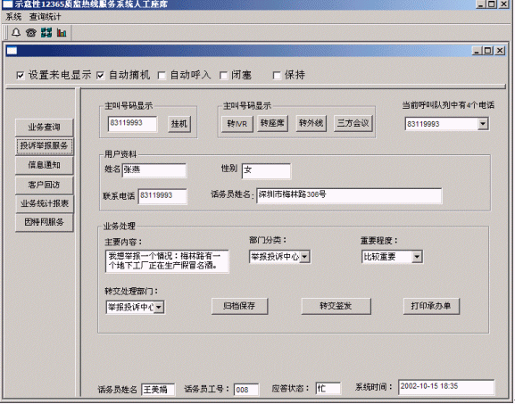 人民群眾打入電話后,當(dāng)系統(tǒng)的自動語音應(yīng)答子系統(tǒng)無法解決客戶問題時,客戶可選擇人工服務(wù),由企業(yè)客戶服務(wù)代表直接接聽客戶電話,處理并解決客戶問題。此時客戶同座席話務(wù)人員直接溝通,并同時記錄下該客戶的聯(lián)系方式,將相關(guān)數(shù)據(jù)添加入系統(tǒng)數(shù)據(jù)庫;也可以在數(shù)據(jù)庫的支持下回答質(zhì)量監(jiān)督咨詢、投訴等?蛻粢部梢赃x擇自動語音服務(wù)方式,根據(jù)系統(tǒng)的語音提示輸入按鍵,選擇類別,將自己的投訴和建議以及自己的聯(lián)系方式信息以留言錄音的方式保存在系統(tǒng)中。系統(tǒng)同時還支持自動傳真方式,客戶可以通過傳真機(jī)進(jìn)入本系統(tǒng),通過按鍵選擇傳真方式,將自己的意見建議等的文本內(nèi)容傳真給系統(tǒng),系統(tǒng)自動接受并存入數(shù)據(jù)庫。