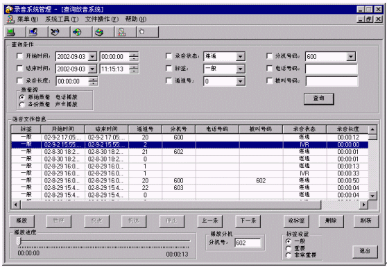 對查詢出來的聲音文件,可以選定一個(gè)或多個(gè)通過電話或聲卡播放。