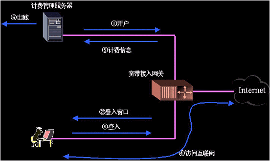 當(dāng)用戶選擇上網(wǎng)后。管理人員首先通過計(jì)費(fèi)管理服務(wù)器為用戶開戶。出用戶在打開瀏覽器試圖訪問Internet時(shí)會(huì)彈來自接入網(wǎng)關(guān)要求登入的窗口。用戶輸入用戶名、密碼并可以選擇適合自己的資費(fèi)方式。輸入信息后接入網(wǎng)關(guān)將信息交由計(jì)費(fèi)管理服務(wù)器處理。計(jì)費(fèi)管理服務(wù)器驗(yàn)證通過后,向該用戶開放互聯(lián)網(wǎng)出口。在用戶訪問互聯(lián)網(wǎng)的同時(shí),接入網(wǎng)關(guān)計(jì)錄下該用戶訪問互聯(lián)網(wǎng)的相關(guān)信息,其中包括訪問的時(shí)長和數(shù)據(jù)流量。接入網(wǎng)關(guān)實(shí)時(shí)地向計(jì)費(fèi)管理服務(wù)器更新用戶的計(jì)費(fèi)信息,用戶斷網(wǎng)后計(jì)費(fèi)管理服務(wù)器計(jì)算用戶上網(wǎng)費(fèi)用。