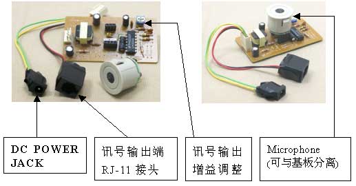| 電氣特性 | MIC:電容式麥克風 MIC靈敏度:-63 dbm 輸出阻抗:10KΩ 輸出接頭:RJ-11 放大增益:0 ~ 10倍 電源:DC 12V;2.5 mA 電源接頭:DC Power Jack |