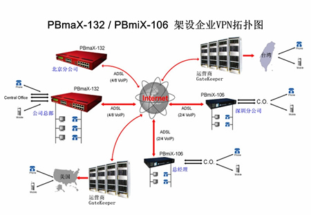 對于具有多個分支機構(gòu)的公司,PBmaX/PBmiX系列IP-PBX能夠通過內(nèi)建的VoIP通道將各分支機構(gòu)連接起來。使撥打遠程分機如同撥打本地分機 一樣簡單,且無需支付任何長話費用。