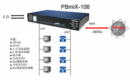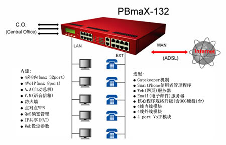 在21世紀的今日,隨著網(wǎng)絡(luò)應(yīng)用的普及,無論是個人或企業(yè)對于交換機的觀念若仍拘泥于傳統(tǒng)的思維,將是落伍的。免費網(wǎng)絡(luò)電話、分散式系統(tǒng),將是傳統(tǒng)交換機 在增加語音信箱/自動總機功能之后,系統(tǒng)機制的重大變革。本公司推出的PBmaX/PBmiX系列IP-PBX,不但將上述所有功能整合于一體,進一步可內(nèi)建公司VPN、Web服務(wù)器、GateKeeper等功能,呈現(xiàn)出數(shù)字交換機的全新風貌,并將新的電話使用觀念帶進企業(yè)、SOHO辦公室與家庭內(nèi)。